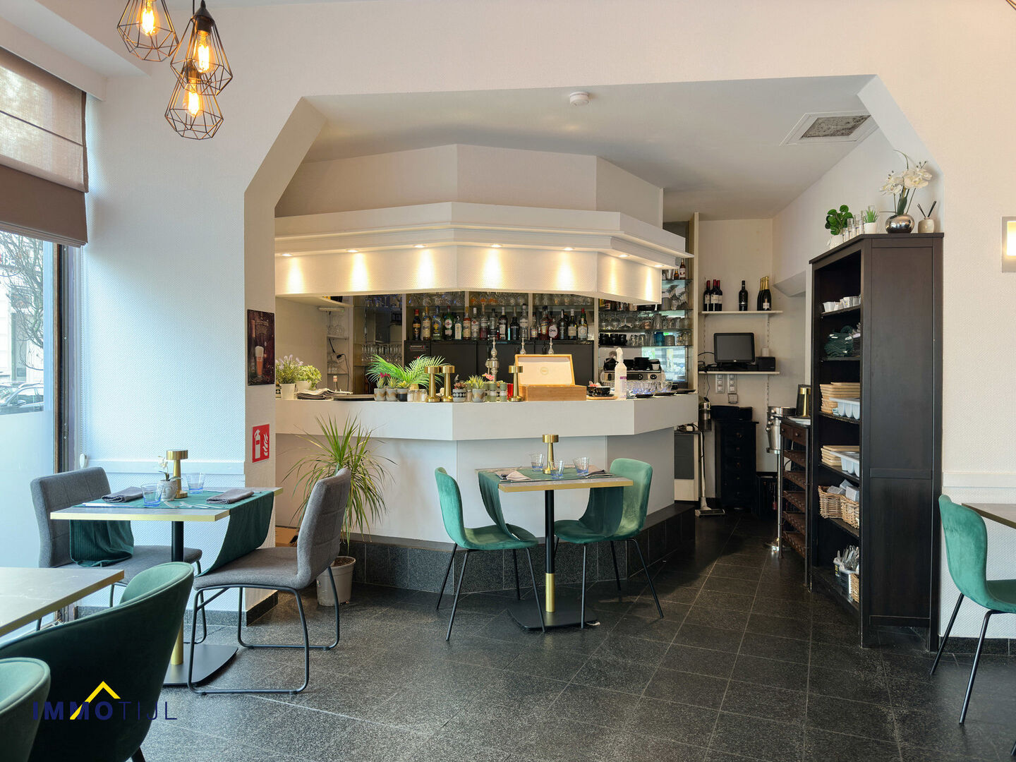 Op het gelijkvloers bevindt zich een moderne, uitnodigende ruimte met bar en ingerichte keuken, perfect voor een restaurant, café of andere commerciële invulling. De eerste verdieping beschikt over een extra zaal, ideaal als eetruimte, vergaderzaal of coworking space. Verder zijn er aparte toiletten (man/vrouw), een berging en een badkamer met douche-in-bad, lavabomeubel en toilet.