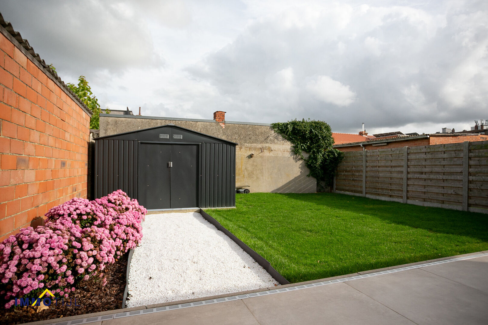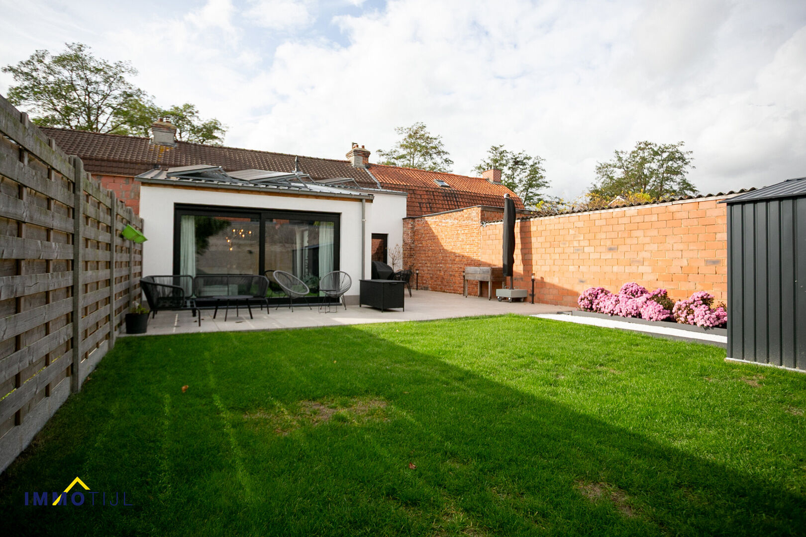 De voortuin werd smaakvol aangelegd en biedt niet alleen een verzorgde eerste indruk, maar ook een praktisch overdekt fietsenhok, achteraan geniet je van een gezellige, onderhoudsvriendelijke tuin met tuinhuis en een gunstige oriëntatie die zorgt voor veel zonlicht en een aangename sfeer, zowel overdag als ’s avonds.