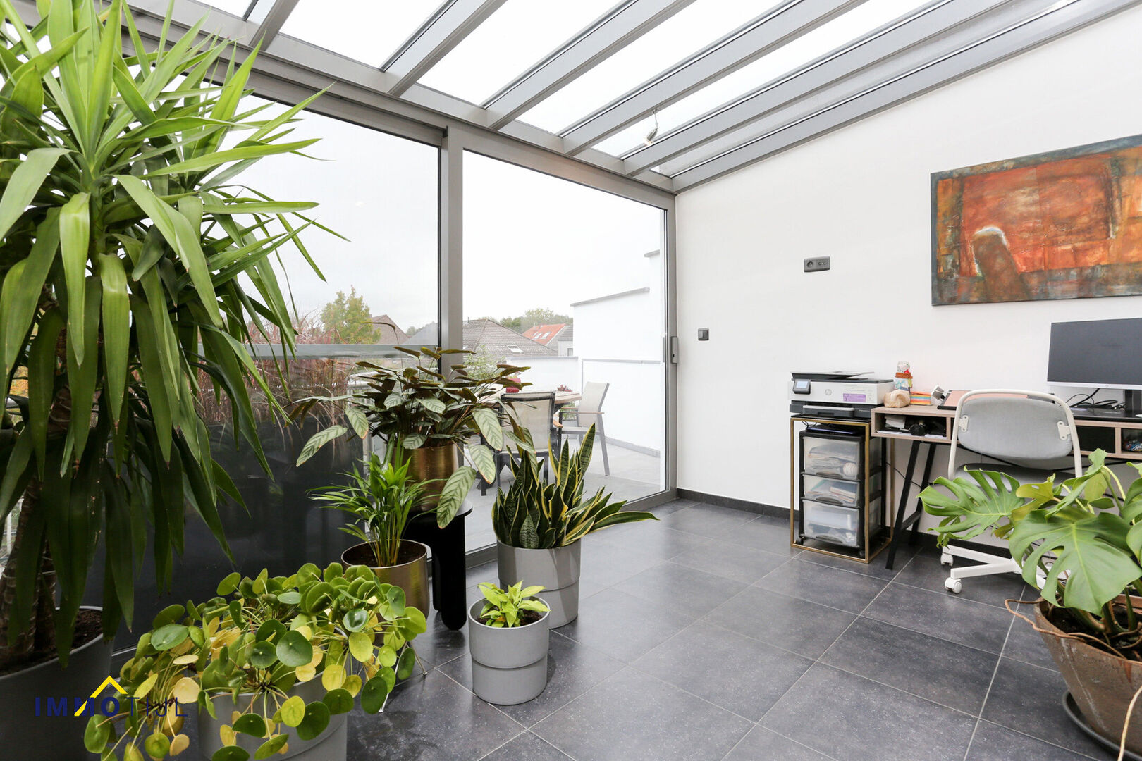 Deels overdekte terrassen in connectie met de aangename tuin. Overal dubbele beglazing, rolluiken en cv op aardgas = gunstig EPC (label C), mede dankzij de aanwezige zonnepanelen (4975 wattpiek).